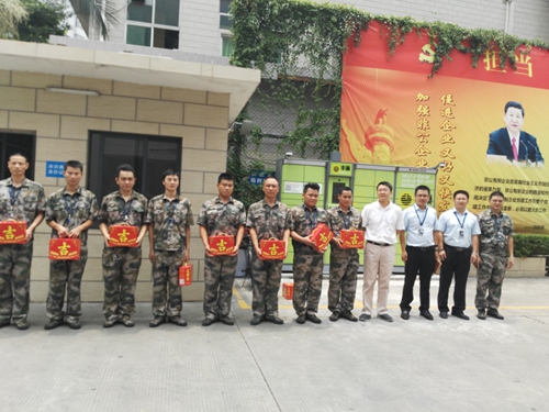 值此8月1日,中國人民解放軍建軍89周年之時,集團總裁趙術(shù)開、總裁辦主任范叢明、物業(yè)管理公司副總經(jīng)理何先兵對公司一線保安們進行了“八一”建軍節(jié)走訪慰問送