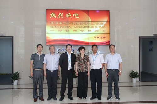 7月17日,蕪湖市三山區(qū)區(qū)委書記賈曉燕,副區(qū)長強(qiáng)健,招商局副局長晉松一行前來華訊參觀考察。總裁趙術(shù)開、副總裁唐永健、總裁辦主任范叢明等領(lǐng)導(dǎo)出面予以接待?! ”敬慰疾?/div>